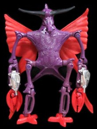 uomo-zanzara dalla pelle viola, con ali rosse e chele da crostaceo. Egli